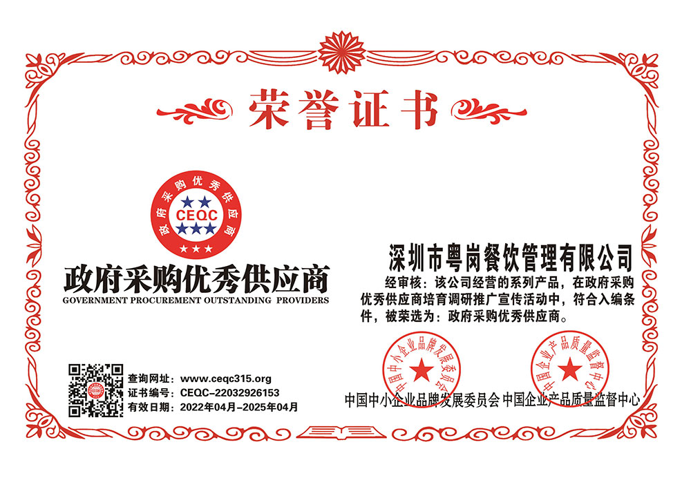 深圳市粵崗餐飲管理有限公司,是一家集蔬菜種植和農(nóng)副產(chǎn)品配送為一體的專(zhuān)業(yè)型餐飲公司,主要為學(xué)校、工廠企事業(yè)機(jī)關(guān)單位提供蔬菜和農(nóng)副產(chǎn)品配送服務(wù)。公司自成立以來(lái)始終以質(zhì)優(yōu)價(jià)廉、服務(wù)至上為原則,嚴(yán)格按照ISO:9001國(guó)際標(biāo)準(zhǔn)體系進(jìn)行管理。同時(shí)建立了行業(yè)領(lǐng)先的配送中心、大型冷庫(kù)和保鮮庫(kù)、檢測(cè)中心以及專(zhuān)業(yè)化的配送團(tuán)隊(duì),能長(zhǎng)期安全、穩(wěn)定、準(zhǔn)時(shí)的配送貨物。我們所有蔬菜均經(jīng)過(guò)初步加工、無(wú)黃葉,無(wú)泥沙等雜質(zhì),利用率達(dá)97%以上...保障向用戶提供的各類(lèi)食材的衛(wèi)生和質(zhì)量。公司為了適應(yīng)不同客戶的需求,配有專(zhuān)業(yè)人員和配送車(chē)輛,實(shí)行“一對(duì)一”的服務(wù)體制,一心一意的為客戶服務(wù),秉承粵崗誠(chéng)實(shí)守信、服務(wù)第一、客戶至上的服務(wù)標(biāo)準(zhǔn),真正讓客戶花最少的錢(qián)吃最好的菜。粵崗多年來(lái)何以欣欣向榮,因?yàn)槲覀冎乐挥杏掠趽?dān)當(dāng)責(zé)任,才能承擔(dān)更大的責(zé)任,就是因?yàn)?粵崗員工貫徹公司態(tài)度決定一切、細(xì)節(jié)決定成敗的真理,從質(zhì)量抓起,從服務(wù)做起,才創(chuàng)造了如今的規(guī)模化供應(yīng)、統(tǒng)一性配送、專(zhuān)業(yè)化服務(wù)的粵崗。